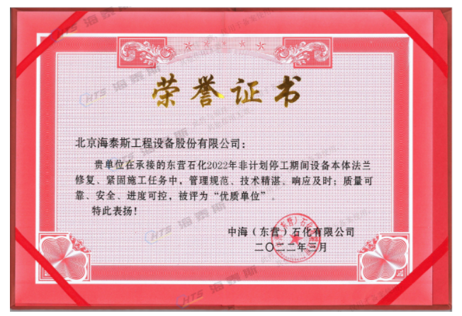海泰斯獲評(píng)“優(yōu)質(zhì)單位”!負(fù)責(zé)的催化裝置、常減壓裝置泄漏法蘭的在線(xiàn)修復(fù)和定力矩緊固施工任務(wù),實(shí)現(xiàn)了“零泄漏”的目標(biāo)。